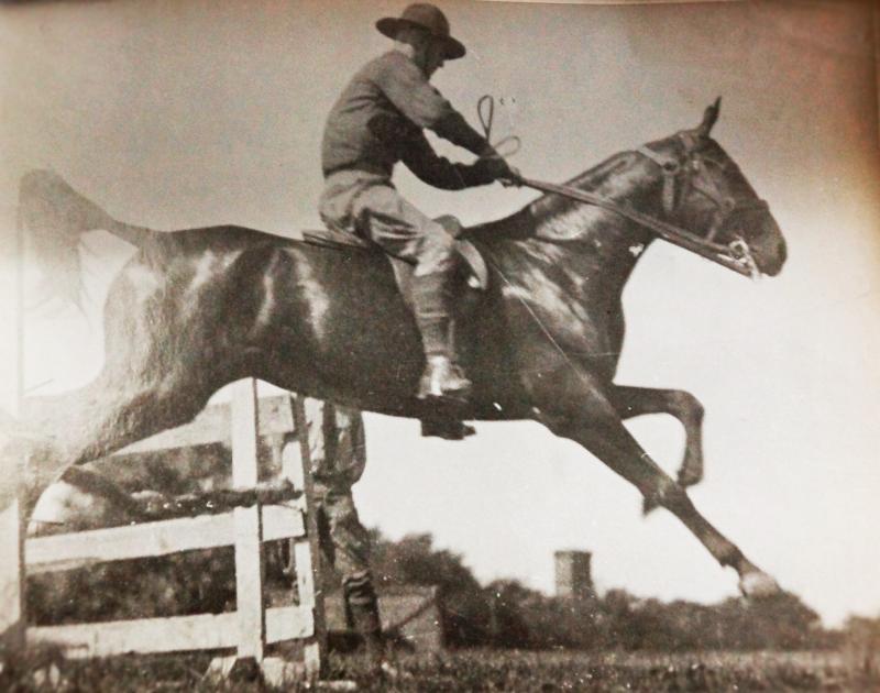 The stable, a long, narrow brick building, has fairly steep roofs above the low ground level, with a clerestory along the ridge, creating a sloping stepped profile at the ends. The openings of the main level are segmental-arched, with wider doors in the centers of the horizontal wall-surface. A small brick addition has been made at one end and a few openings altered or blocked up, but the stable, now used for storage by the Army Reserve, seems to retain much of its original appearance.
