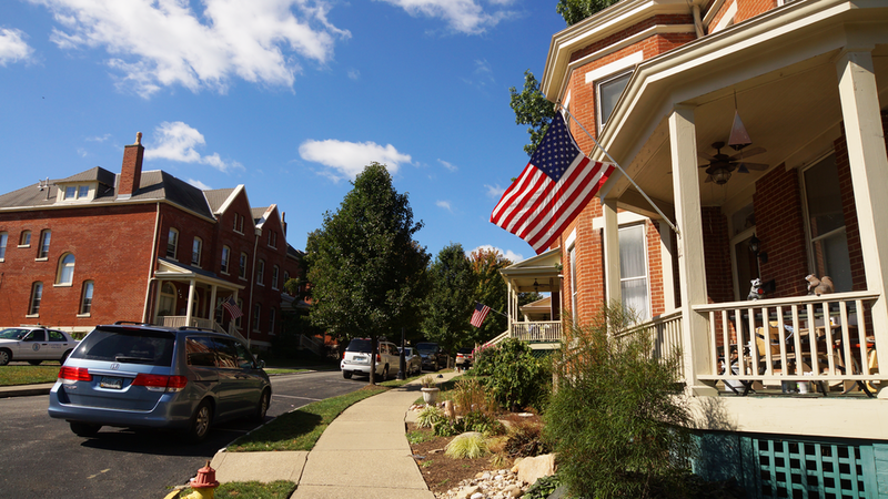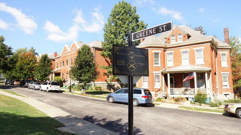 The row houses on Greene Street were built for Military Field Officers. These homes were built by Henry Schriver, completed by 1892. The two-family dwellings face one another; the single homes are built at the ends. The homes have been re-numbered with new postal guidelines.